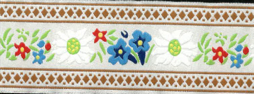 FOLKLORE ENZIAN BAND 100% PES 40°50MM ECRU / BEIGE / WEISS / BLAU / ROT Bestellmenge 25 Meter